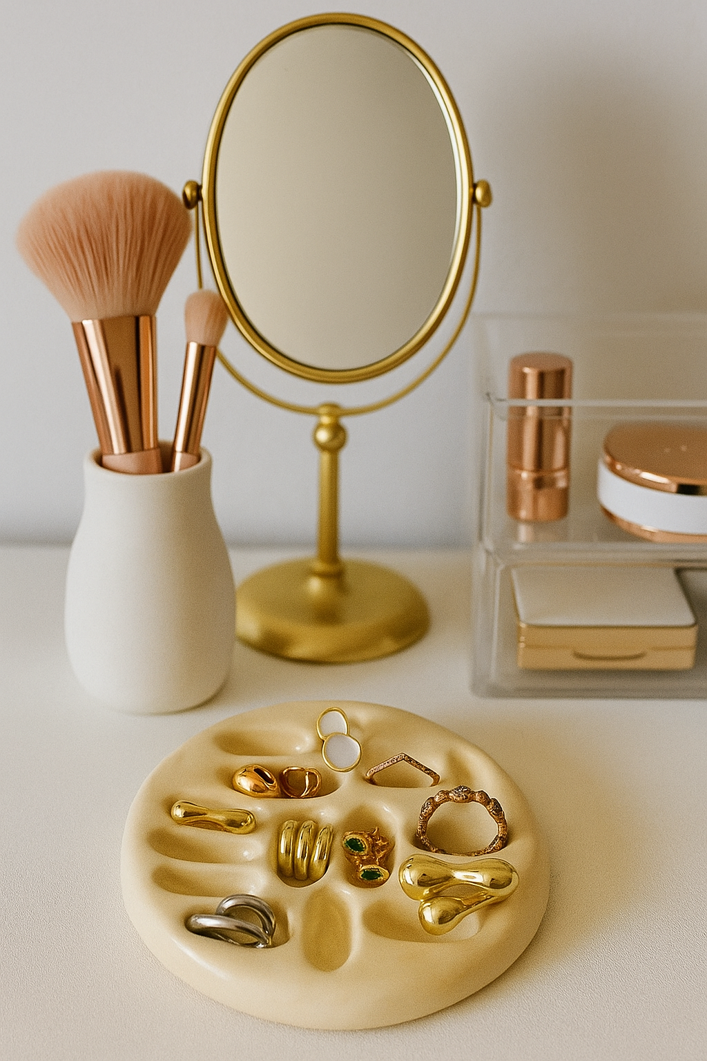 Dale un lugar especial a tus accesorios con este joyero de diseño minimalista. Su acabado suave y elegante realza cualquier tocador, mientras sus compartimentos ovalados mantienen anillos, aretes y pequeñas joyas perfectamente organizados. Ideal para quienes buscan funcionalidad sin perder el toque decorativo.